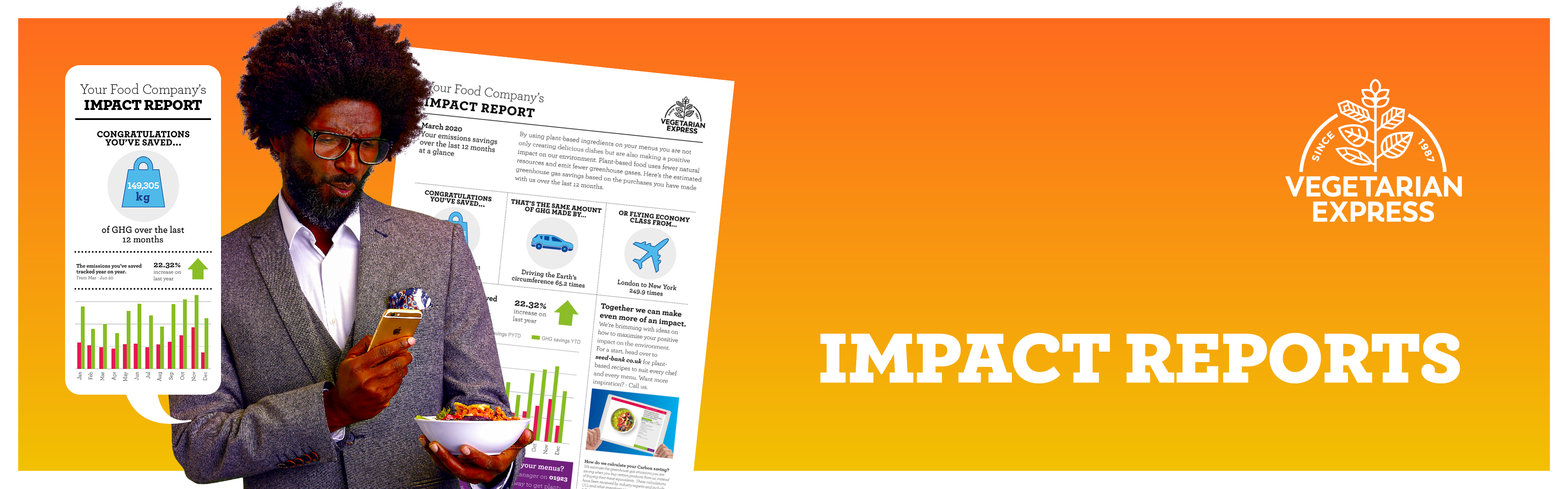 One of the ways in which Vegetarian Express endeavour to support their customers with their ESG agendas is helping them to quantify their greenhouse gas (GHG) savings from choosing plant-based food. To help customers measure their positive impact, Vegetarian Express has developed personalised impact statements. From the moment a customer starts ordering, Vegetarian Express calculate the amount of GHG emissions saved by choosing plant-based instead of the meat alternative. These calculations are made with industry experts, using the latest research. Personalised impact reports are sent out quarterly, showing the positive impact over the last 12 months using meaningful comparisons. They can be created at parent and site level to track environmental goals.